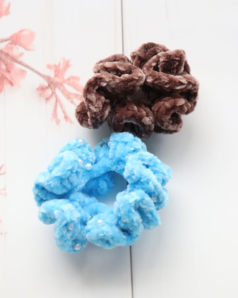 2 premium scrunchies – one in vibrant brown, one in classic sky blue