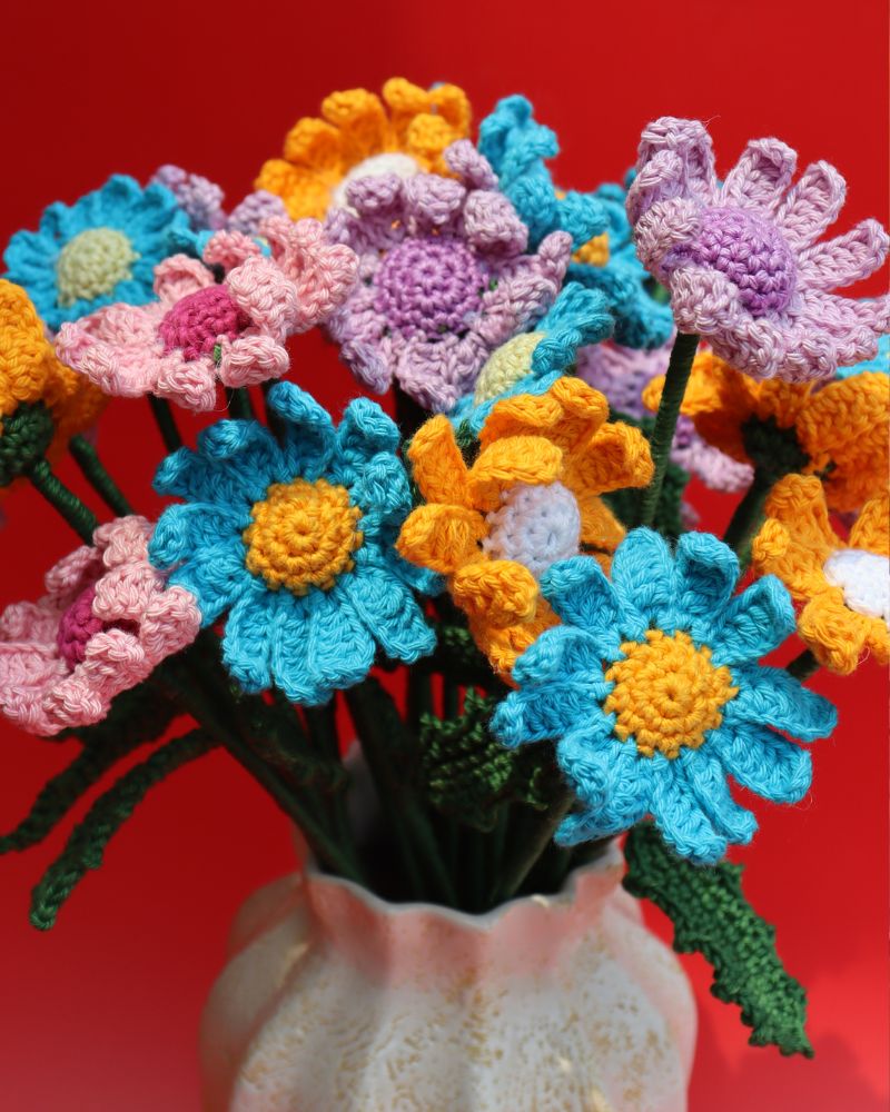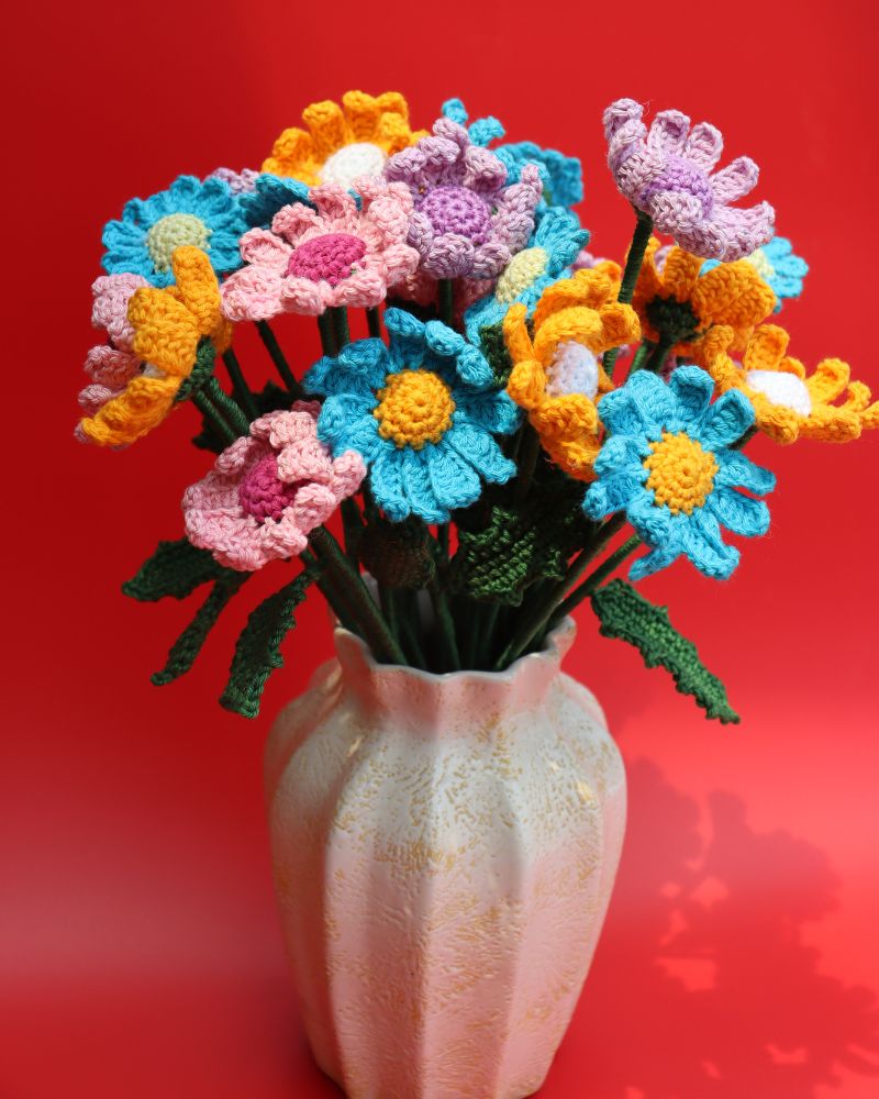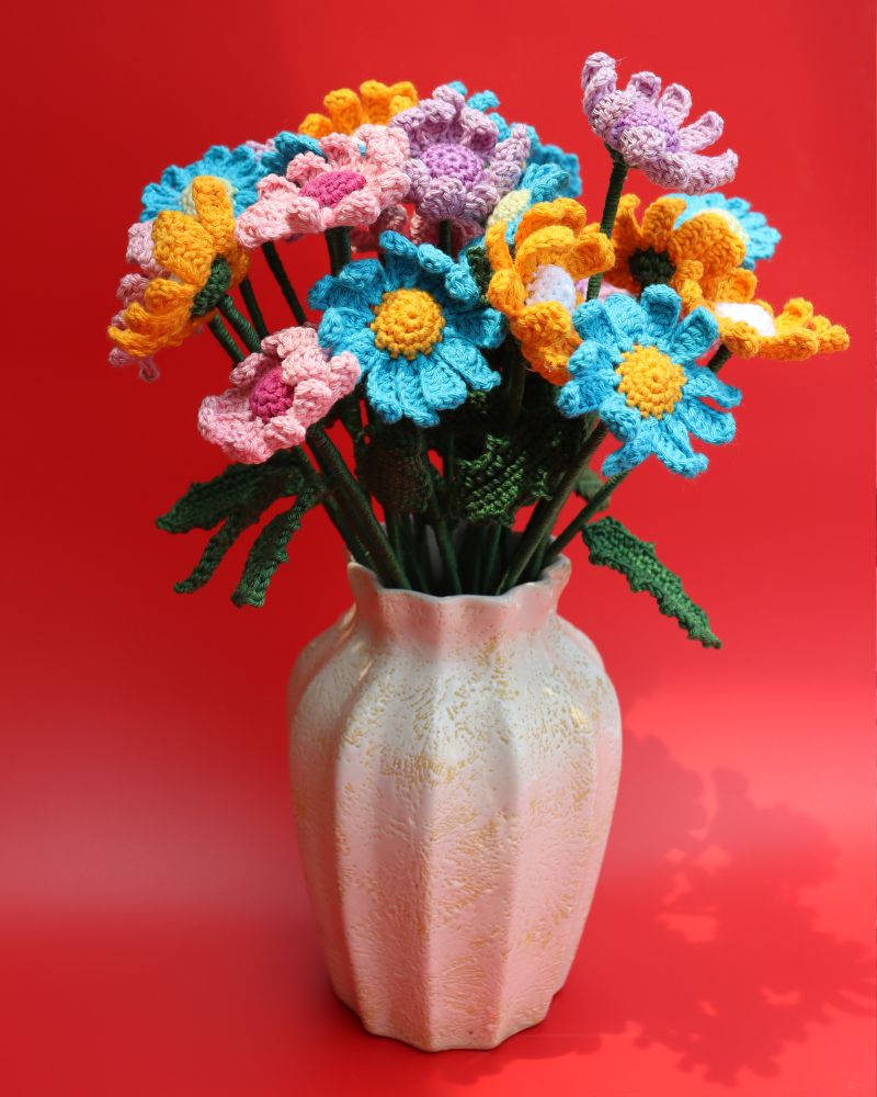One of the biggest advantages of choosing a crochet daisy flower bouquet is its versatility. These flowers make wonderful gifts for birthdays, anniversaries, weddings, housewarmings, or festive celebrations. They symbolise happiness, positivity, and warmth — making them a thoughtful present for loved ones. Unlike natural flowers, these crochet daisies require no maintenance, watering, or sunlight, making them a sustainable and eco-friendly decorative option.