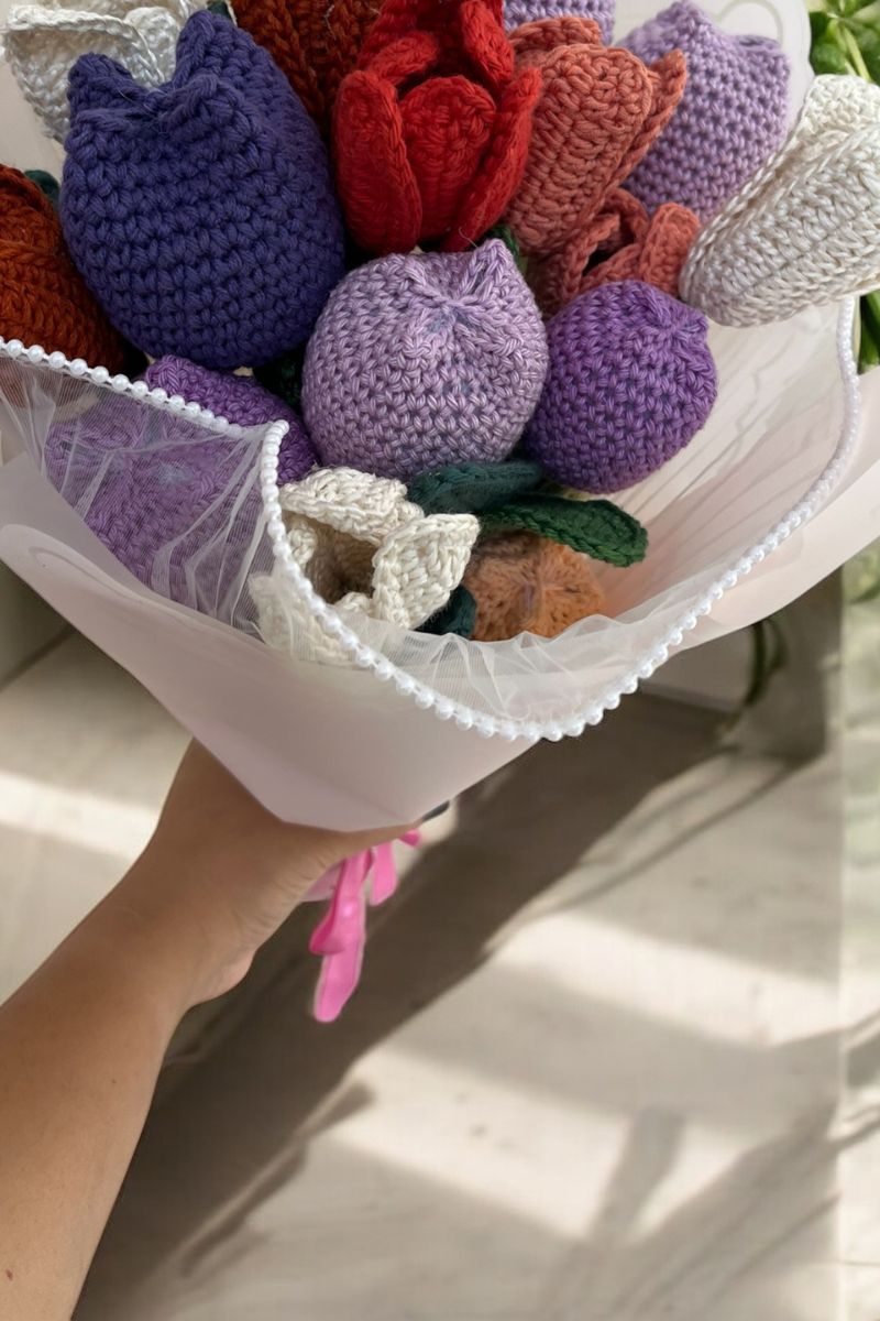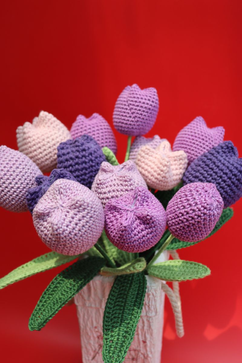 With their gentle colors and closed-bud look, they pair beautifully with open tulips or other crochet flowers for a stunning bouquet.