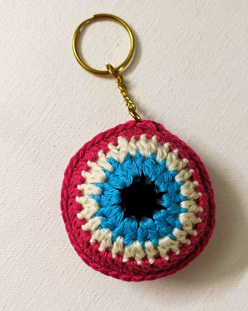 Handcrafted Evil Eye Crochet Keychain — lightweight, durable, kids-friendly & perfect for gifting.