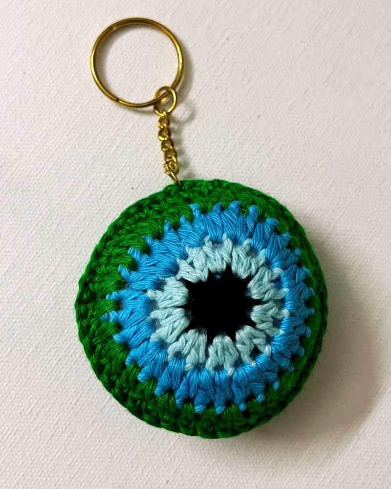 “Cute, colourful, and full of good vibes — your favourite handcrafted crochet evil-eye keychain!”