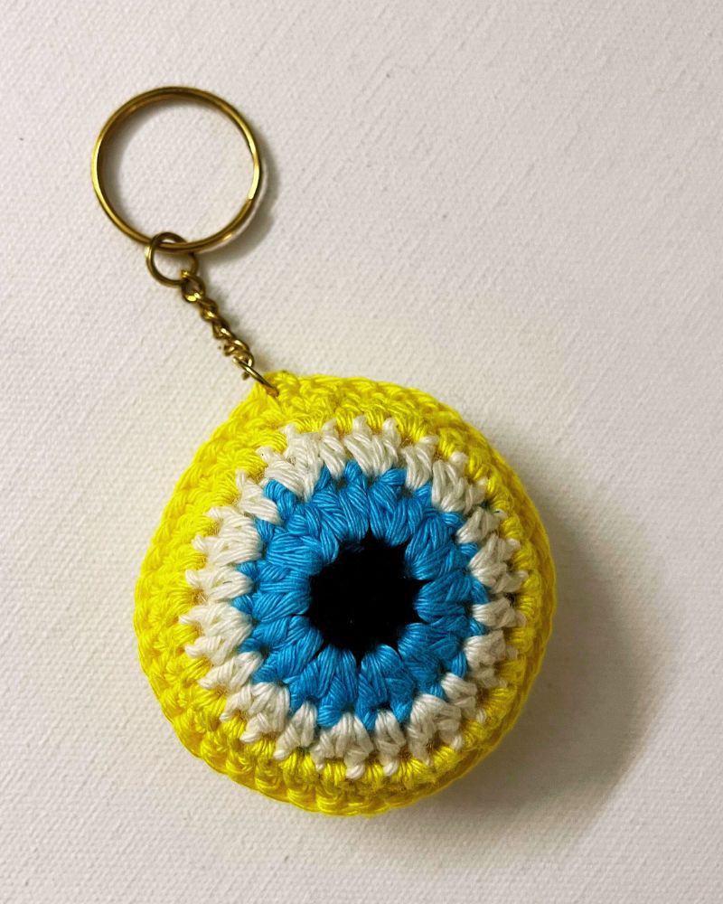 Handcrafted Evil Eye Crochet Keychain — lightweight, durable, kids-friendly & perfect for gifting.