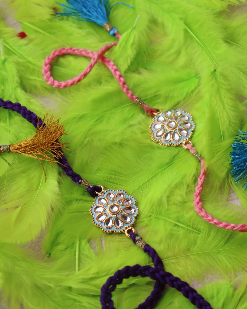 Pair these rakhis with traditional roli-chawal thalis, fresh flowers, and festive sweets to create a memorable Raksha Bandhan celebration. The vibrant palette of each rakhi complements ethnic outfits and festive settings, making it a true centerpiece of the occasion.